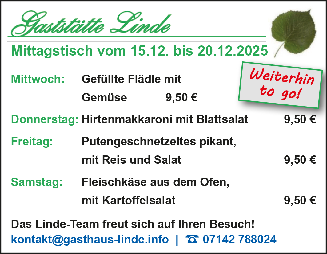 Seit 2009 betreiben wir die Gaststätte Linde in Ingersheim und wollen unsere Gäste mit bodenständiger regionaler Küche erfreuen und stärken. Unsere Köchin Elfriede Löffler setzt Herz und Seele daran, neue Schätze der schwäbischen Küche ans Licht und auf Ihren Tisch zu bringen. Unsere Zutaten sind frisch und möglichst aus der Region. Im Service legen wir besonderen Wert darauf, Sie freundlich und schnell bedienen zu können.